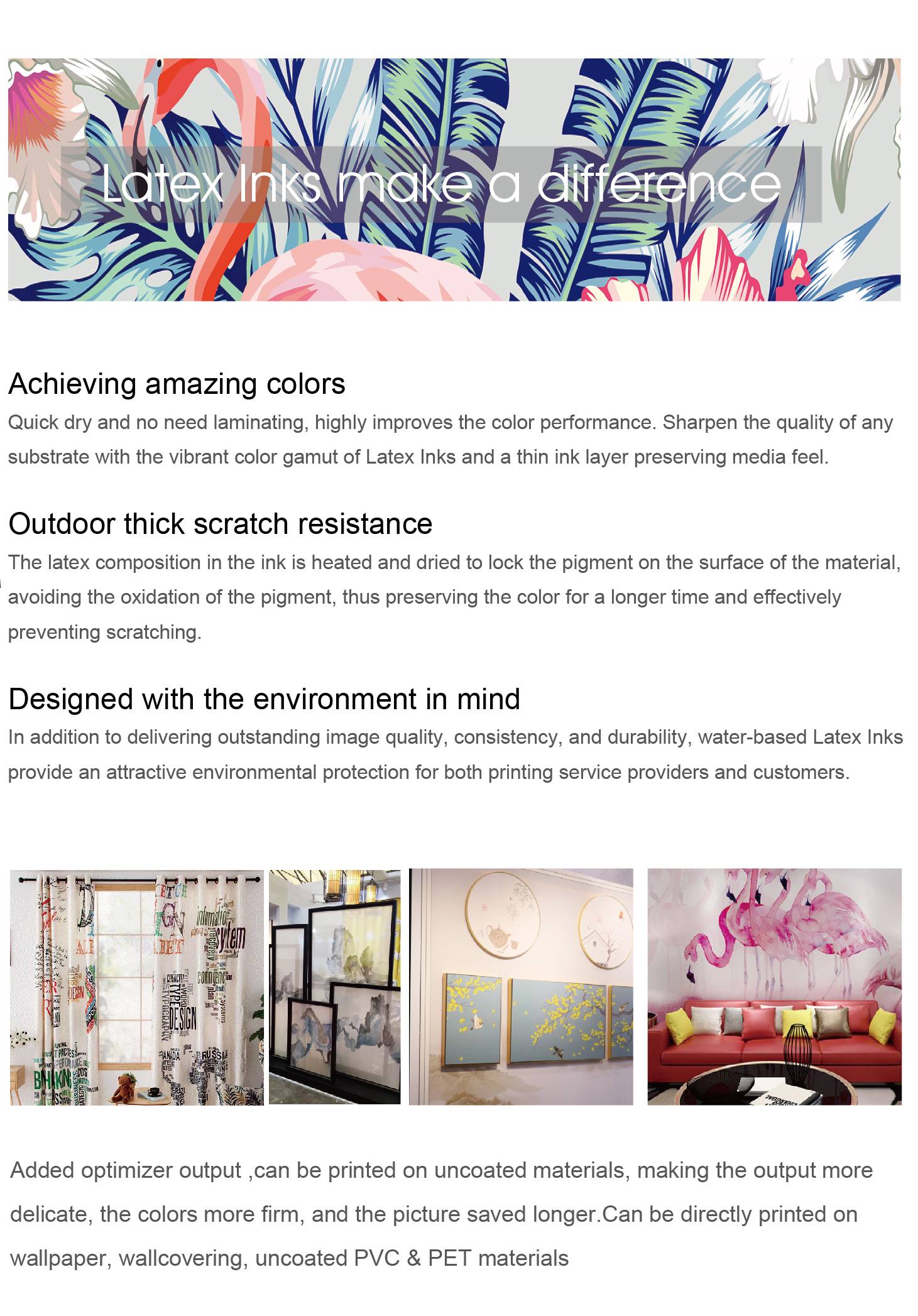 Quick dry and no need laminating, highly improves the color performance. Sharpen the quality of any substrate with the vibrant color gamut of Latex Inks and a thin ink layer preserving media feel.